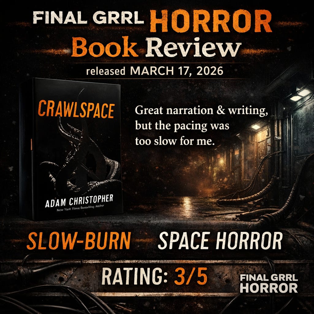 Crawlspace by Adam Christopher, narrated by Jennifer Pickens, was released on March 17, 2026 from Macmillan Audio / Tor Nightfire. The premise immediately appealed to me: deep-space isolation, faster-than-light travel, and a sci-fi horror setup that sounded like it could go in some genuinely eerie directions. The writing itself is good, and the audiobook performance is strong too. Jennifer Pickens made it easy to stay engaged on a sentence-by-sentence level, which mattered here because the prose was never the issue for me.